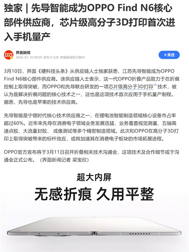 据界面新闻从供应链独家获悉,先导智能成为OPPO Find N6核心部件供应商。双方联合研发的芯片级高分子3D打印技术进一步降低屏幕折痕,这一技术也被认为是折叠屏“无痕化”的核心技术之一。